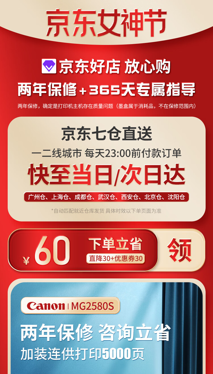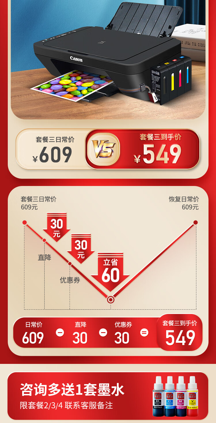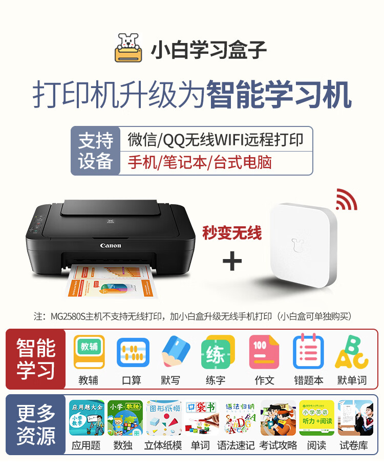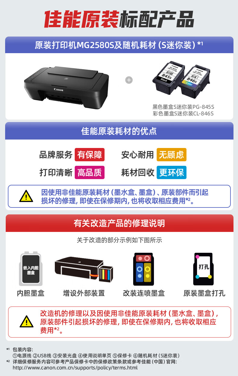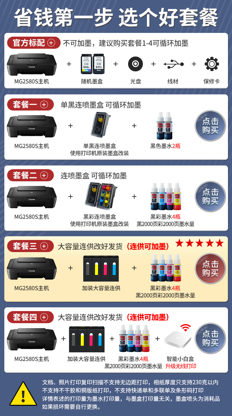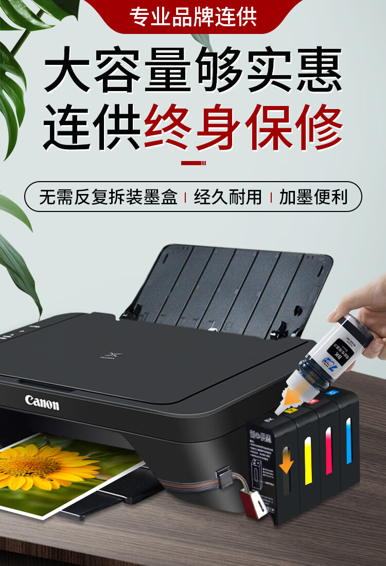 佳能(Canon)MG2580S打印復印掃描一體機噴墨彩色連供打印機家用照片學生辦公可加墨墨倉式a4 套餐三:MG2580S+升級連供+墨水4瓶【推薦】 自營