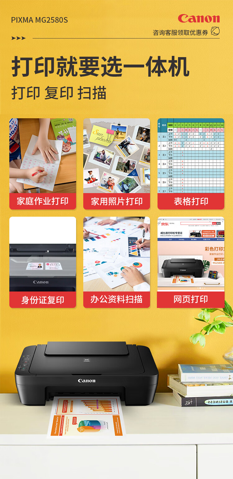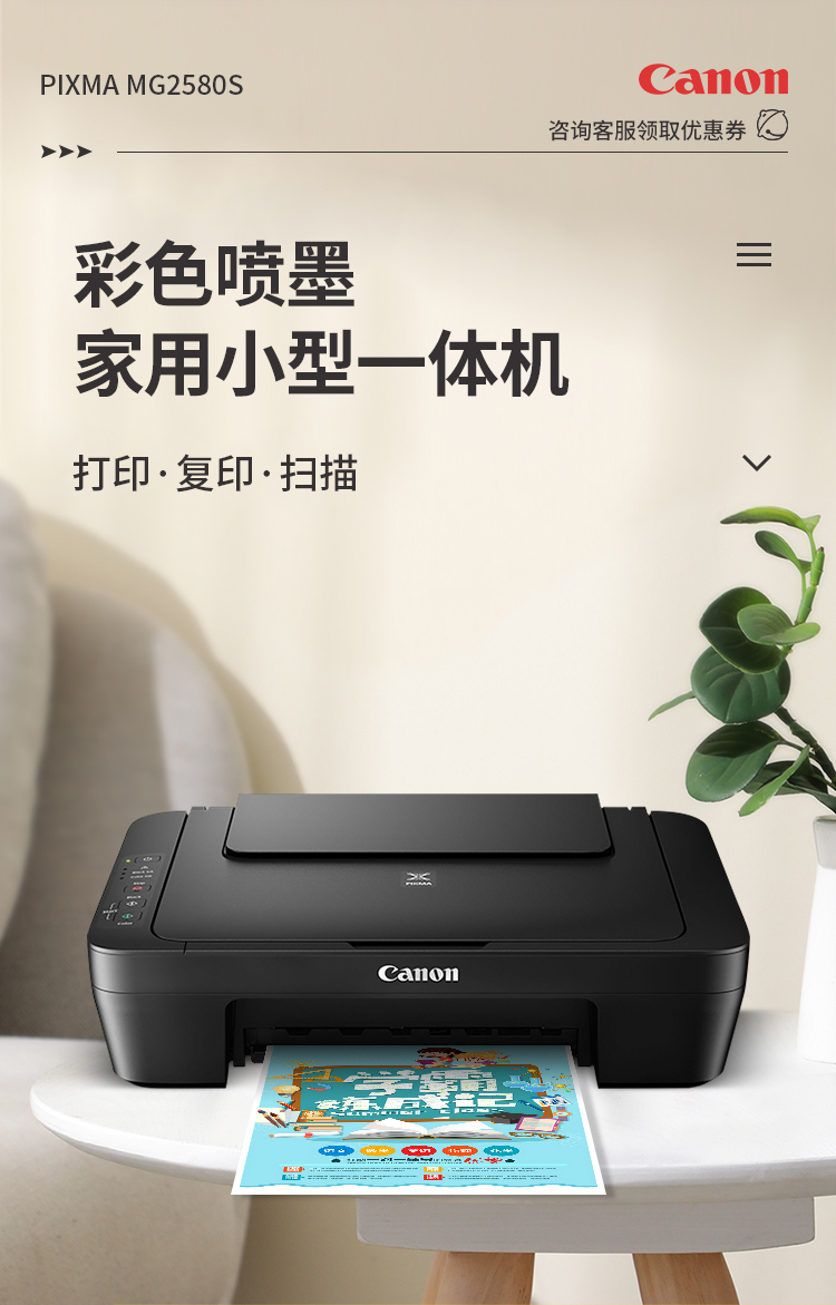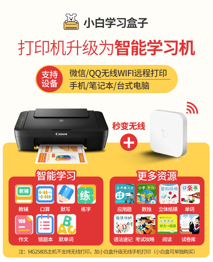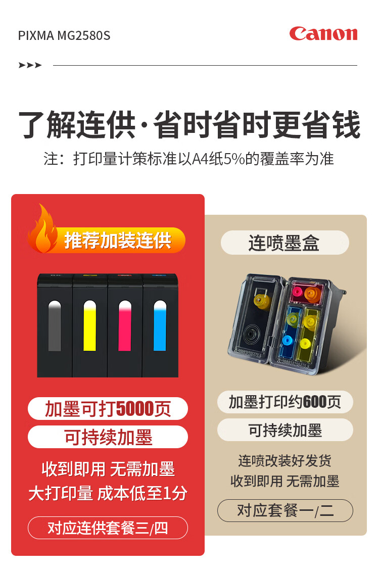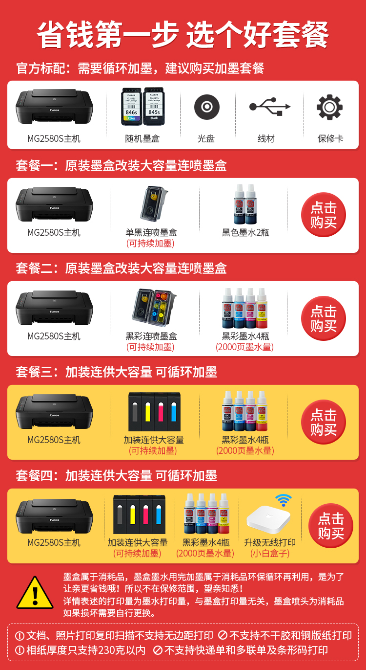 佳能(Canon)MG2580S打印機一體機噴墨彩色照片打印復印掃描家用辦公學生連供加墨 套餐四 MG2580S連供加墨+4瓶墨水+升級無線 自營