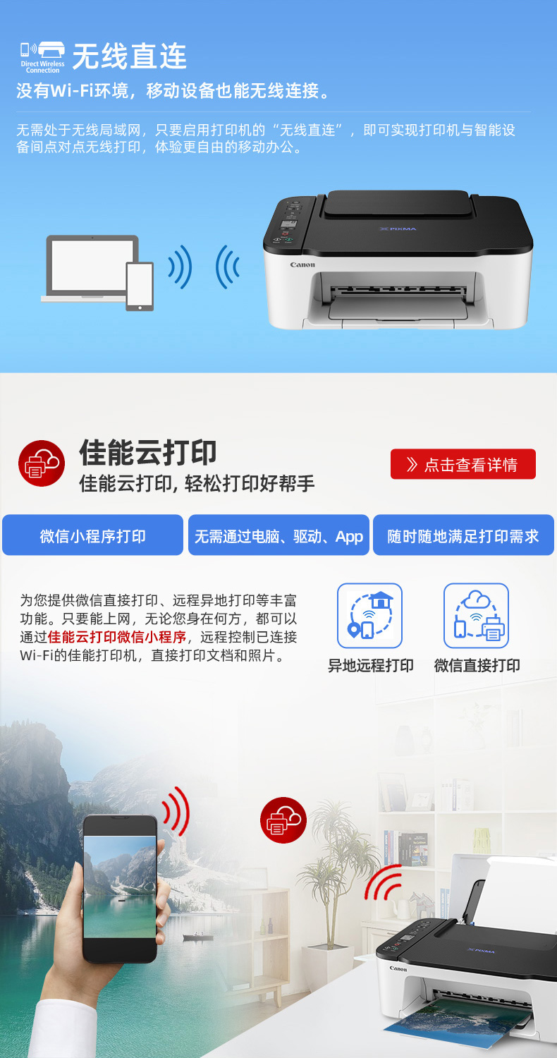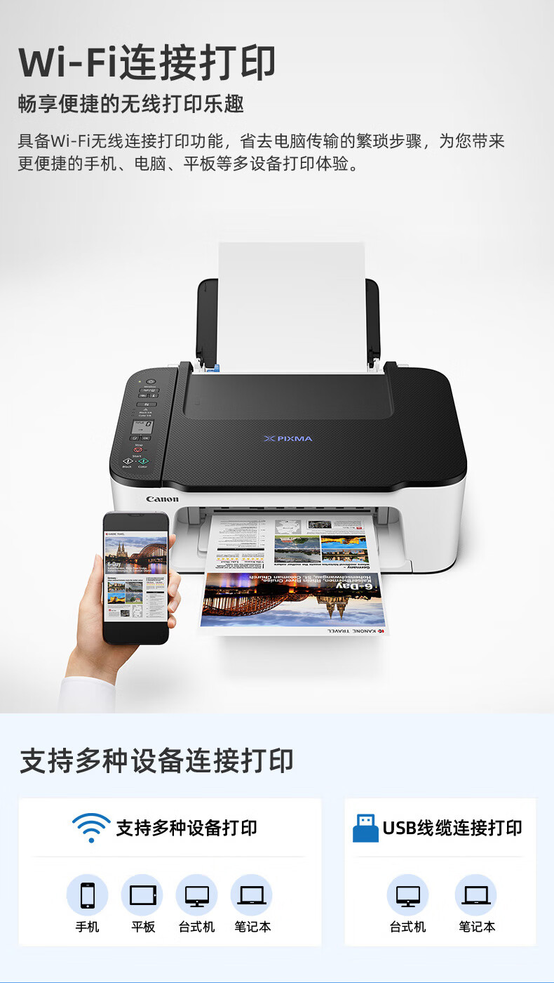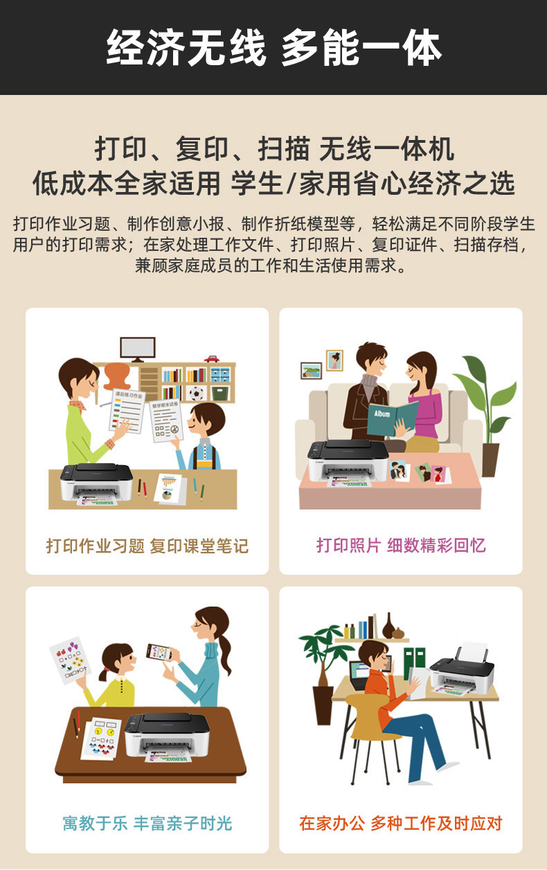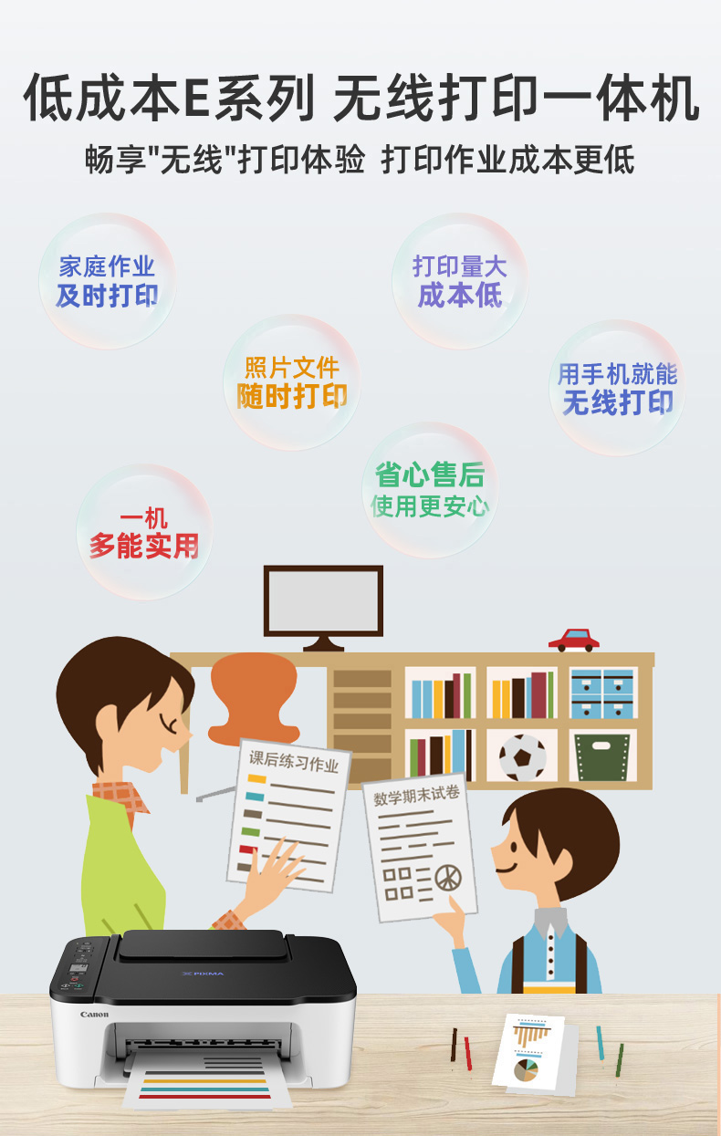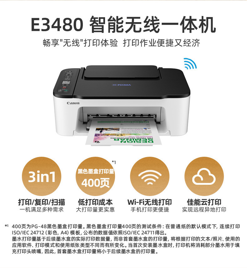 佳能(Canon)E3480 無線學(xué)生家用彩色噴墨多功能一體機(jī)(打印/復(fù)印/掃描 WIFI/云打印 學(xué)生/作業(yè)/照片打印) 自營