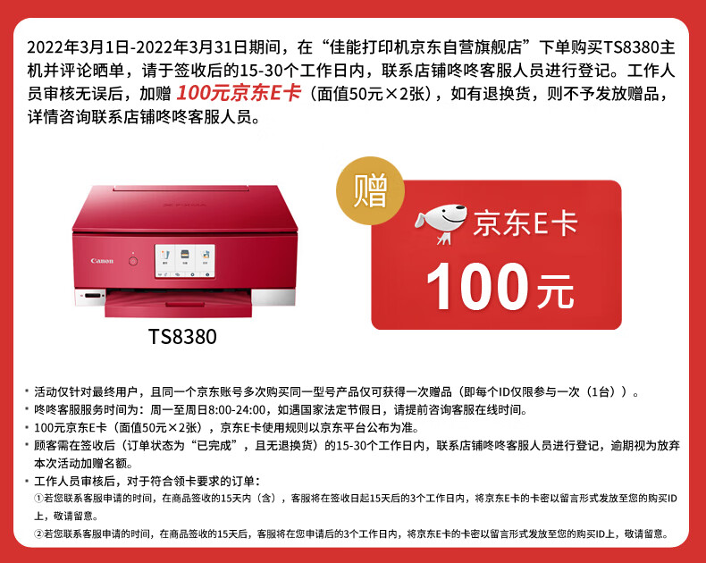 佳能(Canon)TS8380-紅色 無(wú)線家用彩色噴墨多功能照片一體機(jī)(打印/復(fù)印/掃描/自動(dòng)雙面 學(xué)生作業(yè)/照片) 自營(yíng)